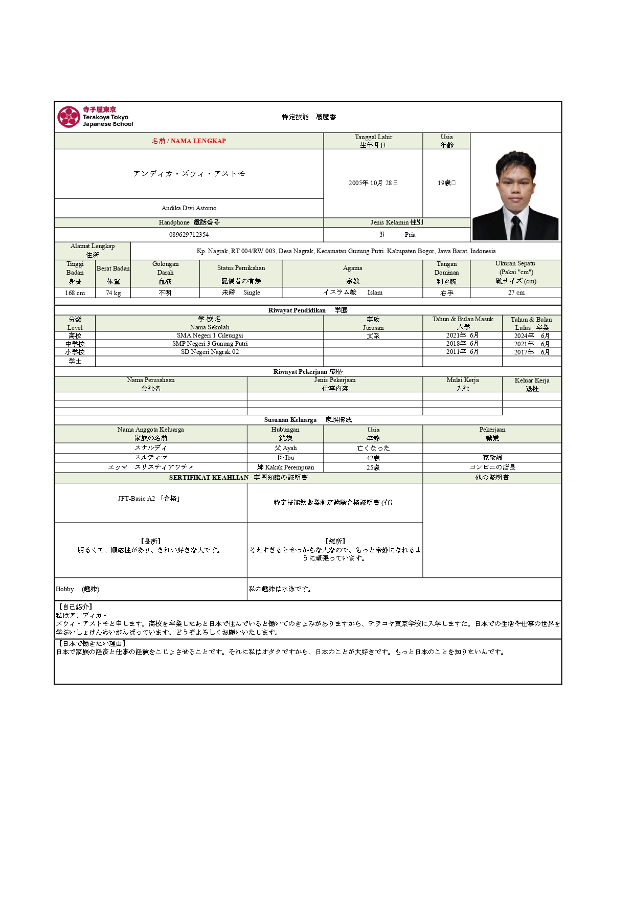 私はアンディカ • ズウィ・アストモと申します。高校を卒業したあと日本で住んでいると働いてのきょみがありますから、テラコヤ東京学校に入学しますた。日本での生活や仕事の世界を学ぶいしょけんめいがんばっています。どうぞよろしくお願いいたします。
