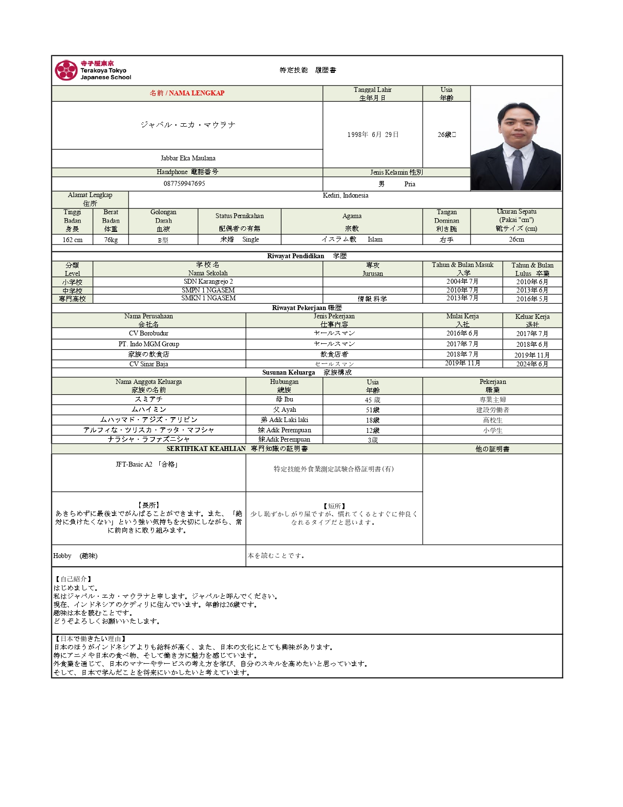 私はジャバル・エカ・マウラナと申します。ジャバルと呼んでください。現在、インドネシアのケディリに住んでいます。年齢は26歳です。趣味は本を読むことです。