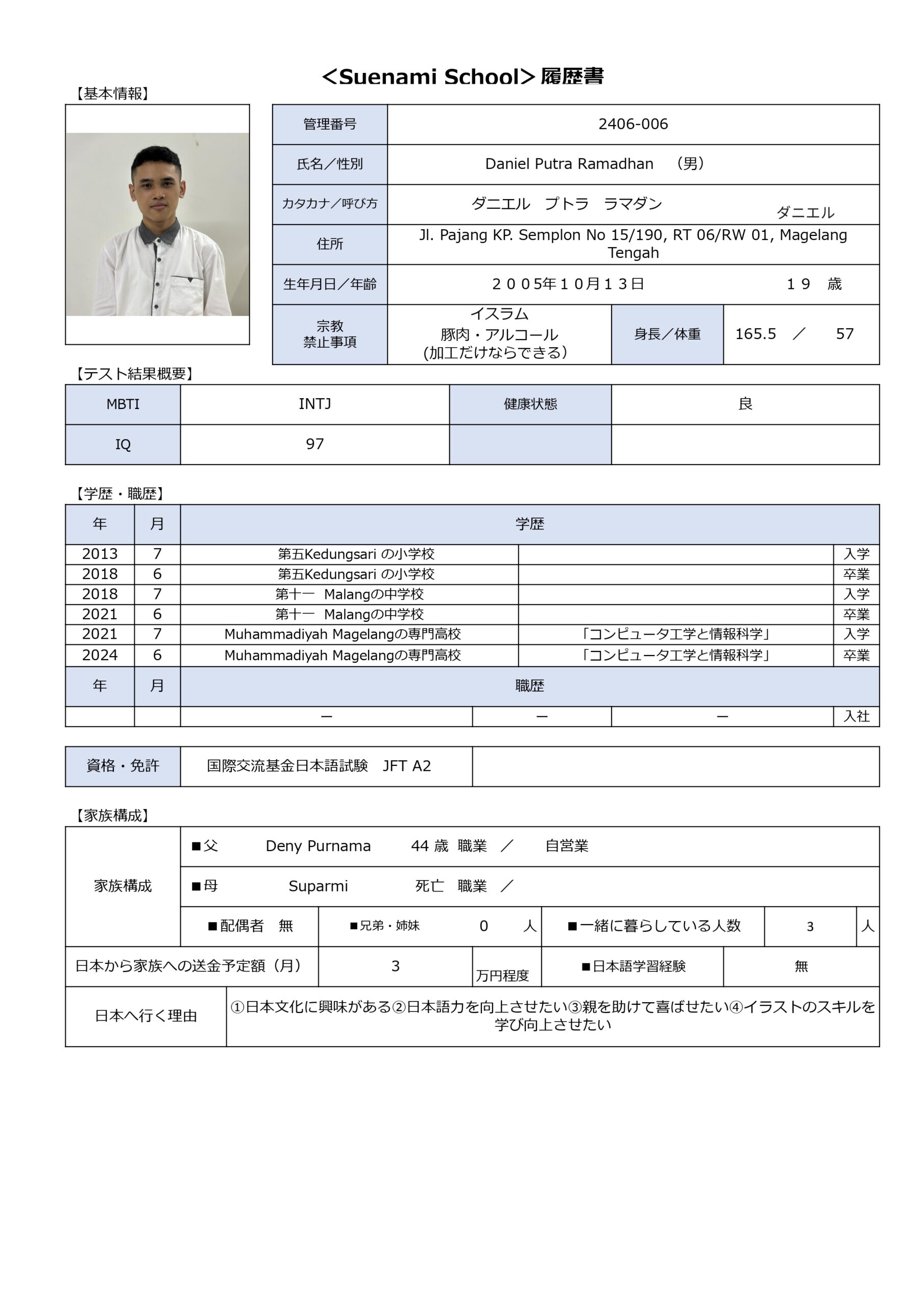 私はダニエル プトラ ラマダンと申します。ダニエルと呼ばれています。私の強みは、コミュニケーション能力が高いことです。前職では、営業職として、お客様との信頼関係を築き、売上目標を達成してきました。相手の立場に立って考え、ニーズを的確に把握し、最適な提案をすることを心がけています。入社後は、このコミュニケーション能力を活かし、社内外の関係者と良好な関係を築き、チームの一員として貢献したいと考えています。